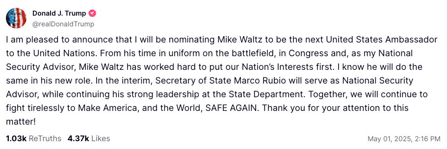 Details: Yesterday, President Donald Trump announced the removal of Mike Waltz as National Security Adviser, nominating him instead as U.S. Ambassador to the United Nations. Secretary of State Marco Rubio was appointed as interim National Security Adviser while continuing his role at the State Department, a rare dual role not seen since Henry Kissinger in the 1970s. Waltz’s deputy, Alex Wong, is also departing the National Security Council (NSC). The shakeup, the first major cabinet change in Trump’s second term, follows intense scrutiny over Waltz’s involvement in the “Signalgate” scandal, where he inadvertently added The Atlantic editor-in-chief Jeffrey Goldberg to a Signal group chat in March 2025, exposing sensitive plans for U.S. military strikes on Houthi targets in Yemen. The chat included senior officials like Defense Secretary Pete Hegseth and Vice President JD Vance, discussing classified details such as strike timelines and weapons systems. Waltz’s tenure was further strained by internal friction, including a strained relationship with White House Chief of Staff Susie Wiles and criticism from far-right activist Laura Loomer, who targeted Waltz and Wong for perceived disloyalty. Waltz, a former Florida congressman and Green Beret, resigned his House seat on January 20, 2025, to join Trump’s administration. His nomination as UN ambassador requires Senate confirmation, which may face challenges due to the Signal controversy. Trump praised Waltz’s service, stating he “worked hard to put our Nation’s Interests first,” while Waltz expressed honor in continuing service on X.